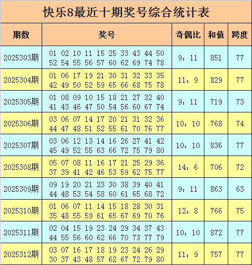 福彩快乐8第2025312期开奖回顾奖号:03 07 16 17 18 19 23 24 26 29 30 37 43 48 57 62 67 72 79 80,其中奖号奇偶比为11:9,和值为757,跨度为77。