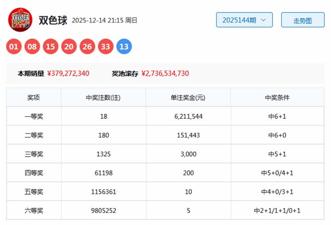 双色球第2025144期开出奖号为01、08、15、20、26、33+13。其中红球号码奇偶比为3:3,三区比为2:2:2,大小比为3:3,蓝球开出奇数号码13。