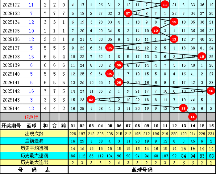 蓝球分析:前5期蓝球号码分别开出:05、06、16、03、13,其中偶数蓝球出现2期,走势较冷,本期注意偶数蓝球回补,看好蓝球号码14。