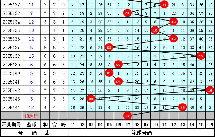 蓝球号码分析:最近30期蓝球号码质合比为16:14,最近10期蓝球质合比为4:6,最近5期蓝球分别为:05、06、16、03、13,本期看好蓝球为质数号码,参考号码07。